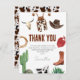 Rústico Cowboy Baby Shower Gracias Tarjeta Dulce, pequeña ducha con temática de vaquero, tarjeta de agradecimiento. Este diseño presenta varios elementos con temática de vaquero y algunos cactus, así como un patrón de impresión de piel de vaca o vaca en la parte posterior.