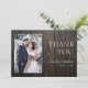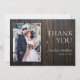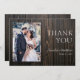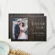 Expresar su gratitud con nuestra Tarjeta de agradecimiento a nuestro Boda de fotos rustico de madera oscura. Con una foto personalizada de una pareja en una orientación vertical, esta carta destaca con su elegante escritura con letras blancas y su antigua letra serif. El fondo de la madera oscura aporta un toque rústico encantador, perfecto para una temática boda. En la parte de atrás, un mensaje sincero en una fuente serif clásica completa esta hermosa tarjeta. Haga que su agradecimiento sea tan memorable como su día especial con este diseño único y personalizado.
