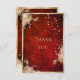 Magnífico spray botánico floral blanco con hojas de oro escasas sobre el colgante de esta hermosa tarjeta boda "Gracias". El fondo rústico rojo escarlata es una moda tan rica. Esta es una carta encantadora. Recortada en un falso purpurina dorado para marcar el tono de la elegancia romántica y clásica. Las salpicaduras de oro terminan con esta nota del boda bonito "Gracias". Hermoso para cualquier temporada.