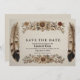 Esta imagen elegante es una tarjeta de estilo vintage con la frase "SAVE THE DATE" en una fuente serif simple. El texto está enmarcado por ilustraciones detalladas y dibujadas a mano de flores, hojas y grandes plumas en tonos terrosos. El diseño general rústico y bohemio es perfecto para una invitación de boda o evento especial. Rellénalo con tus datos para tu día especial.