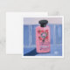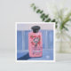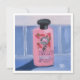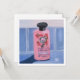 Impresión artística de una botella rosa de champú sobre azulejos azules.