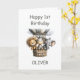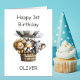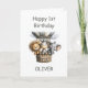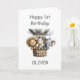 Celebrate a little one’s big milestone with this 1st birthday card featuring a lion, zebra and elephant in a hot air balloon.