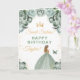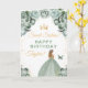 Esta elegante y glamorosa tarjeta de 16 años puede ser personalizada con un nombre o título como hija, nieta, sobrina, amiga, etc. El diseño presenta una hermosa princesa con el pelo rubio en un vestido de bolas verde sabio. El texto combina el guión manuscrito y las fuentes sans serif modernas para un aspecto elegante y sofisticado. Los arreglos florales, mariposa y confitis dorada crean la mezcla perfecta entre rústico y moda. Gráficos de www.etsy.com/uk/shop/SunflowerDayLove