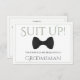 Use esta "tarjeta de presentación de groomsman" para pedirle a sus amigos especiales y familiares que sean un timonel en su boda. Presenta un diseño divertido con un texto verde sabio y una imagen de una corbata de arco negro y dice: Se solicitan sus servicios como Groomsman" Hay un espacio para introducir una nota especial que pregunte "¿será usted mi padrino?", así como los nombres de la pareja boda y la fecha boda. Todos los campos son completamente personalizable.