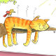 Un lindo gato atigrado naranja duerme en una rama de árbol en el calor del verano. Un pájaro está sentado en su espalda y lo observa.