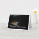 La carta muestra una escena evocadora y empinada con una pequeña cabaña de madera iluminada en medio de un bosque cubierto de nieve. La fuente de luz del interior crea un bonito contraste con el entorno oscuro y tranquilo. La elegante inscripción "Feliz Navidad" en blanco le da al motivo un toque festivo. 🎄 ✨