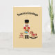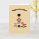Hermosa tarjeta de vacaciones con petcracker, un oso de peluche y un caballo mecedor y personalizar / texto personalizado