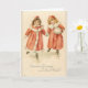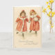 Una ilustración antigua de una tarjeta de Navidad presenta a dos niñas vestidas para un frío día de invierno patinando sobre hielo. Las dos amigas visten abrigos rosados similares recortados en piel blanca con sombreros rosados. Una niña tiene un manguito de piel blanca para mantener las manos calientes, pero han decidido tomarse de la mano mientras patinan lado a lado. La parte delantera de la tarjeta dice "Saludos de Navidad y mejores deseos" y el mensaje dentro de la tarjeta es: "Hay muchos regalos bajo el árbol de Navidad, pero el mejor es el regalo de tu amistad".
