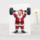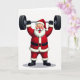 This digital illustration shows a strong Santa Claus lifting a barbell above his head. He wears his classic red suit with white fur trim and a black belt. The colors are bright and stand out against a white background. Santa's face looks exaggerated with big eyes, rosy cheeks, and his tongue sticking out. The image has a playful vibe, showing Santa as not just jolly but also strong and ready for anything. The lighting emphasizes his round shape and cheerful personality. The card could say "Wishing you a strong and joyful holiday season 🎅🏼🎄🎁" and is perfect for spreading holiday cheer to others.