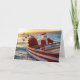 Santa Claus joyfully navigates a speedboat, with a festive red bag overflowing with toys spilling out as he glides across the water.