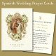 Con una hermosa imagen católica tradicional de la imagen de los esponsales de María y José con un borde dorado decorativo acentuado con flores blancas y un fondo de encaje blanco. Una oración en español está en el reverso para la novia y el novio. Todo el texto y las fuentes se pueden modificar.