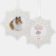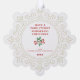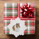 Un delicado marco dorado ornamentado con copos de nieve rodea tu foto favorita. En la parte trasera hay un texto en rojo que dice "¡Que tengan Navidades maravillosos y atractivos!" Este texto puede editarse haciendo clic en "personalizar esta plantilla". También hay un lugar para incluir los nombres de sus familias y el año.