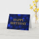 Tarjeta de saludo de cumpleaños de moda con las palabras "Feliz Cumpleaños" en Relieve metalizado de oro falso contra un fondo de patrón de luces de bokeh azul zafiro. Para agregar texto al interior de la tarjeta, haga clic en el botón "Personalizar". *Tenga en cuenta que la marca de agua Zazzle que aparece en la vista previa del zoom NO aparecerá en el producto impreso final. © Rosewood y Citrus