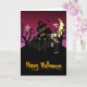 Ilustracion de la aterradora escena de Halloween con el pañuelo oscuro sosteniendo un cráneo frente a una vieja casa embrujada.