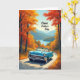 This design shows a classic turquoise convertible 🚗 gliding along a curving asphalt road through an autumn forest, its chrome details catching the light like a polished keepsake. Tall trees crowd in on both sides, their leaves shifting through amber, gold, and deep orange, creating a cozy tunnel that feels made for a shared drive and quiet conversation. In the distance, rolling hills fade into a soft blue haze and cradle a calm lake that reflects the clear sky. Sunlight streams across the scene, laying gentle shadows over the road and adding depth to the layered foliage. Near the top of the card, a short Father’s Day message appears in a flowing white style, arcing slightly across the sky so it stands out without overpowering the artwork. The open-top car suggests someone special in the passenger seat 👨, with the road ahead hinting at easy companionship and steady care. The windshield glints, the tires trace the bend, and scattered leaves line the roadside beneath the glowing canopy.