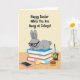 Designed with a cozy study-table scene, this digital illustration features a soft grey bunny wearing black-rimmed glasses, perched atop three textbooks in blue, orange, and rosy pink 🐰. The bunny’s gentle posture and calm gaze add a sweet, companionable tone, like it’s keeping someone company during a late-night study session. Everything sits on a warm wooden surface, surrounded by student essentials that make the moment feel shared rather than solitary. On the left, a slim personal device in a bright pink case rests near the edge, angled as if just set down after a message. In front of the books, three speckled pastel eggs in pink, yellow, and light blue hint at the season, with a small touch of 🌷 nearby to soften the scene. A clear cup holds a dark iced drink with a straw and a simple green emblem, sitting close to a chocolate-frosted doughnut covered in colorful sprinkles. Across the upper area, a large hand-lettered holiday greeting appears in a darker ink tone, standing out against the light background. The final touch is the trio of eggs lined neatly before the stacked books, their tiny speckles visible against the smooth pastel shells.