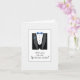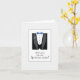 ¿Serás mi padrino? Cuando es hora de invitar a tu fiesta de bodas, esta carta es la manera perfecta de empezar. Un esmoquin negro con corbata azul y flor de solapa frente a un fondo gris claro a rayas. ¡Una tarjeta tan guapa para comenzar el proceso de boda con su solicitud de padrino!