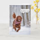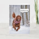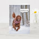 Irish Setter vistiendo una bufanda de cuchillos corriendo en bosques de invierno para humor de cumpleaños. Se puede cambiar todo el texto.