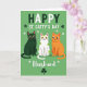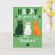 This card shows three stylized cats sitting close together against a rich green background dotted with shamrocks ☘️. In the center is a white cat sprinkled with small green clover shapes, looking forward with wide eyes and a soft smile as if leaning into the company beside it 💚. On the left, a dark teal cat sits upright with an eager, friendly gaze, and on the right, a marmalade-orange cat mirrors that gentle expression, creating a cozy, together-at-the-party feel. Across the top, the text “HAPPY ST. CATTY’S DAY” spans the width in a mix of dark green and white letters that pop against the green field. Near the bottom, the word “Husband” appears as a simple address beneath the cats, set apart so it reads like a quiet note meant for one person. Shamrock icons in different sizes and greens float around the trio, adding movement and guiding your eye from the headline down to the namesake cat. The cats’ rounded shapes and slightly shaded edges give them a subtle sense of depth, with clovers scattered like confetti across the background. The scene is framed by the centered trio, with clover clusters sprinkled above their ears and along the lower corners.
