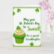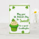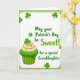 This card features a white, rounded-corner panel framed by a patterned green border, setting a cozy St. Patrick’s Day scene 💚. In the lower-left corner sits a green-striped cupcake wrapper topped with three soft swirls of vanilla-colored frosting, like a sweet treat saved for someone special. Tiny shamrock sprinkles dot each frosting peak, and a larger shamrock topper stands upright as the finishing touch ☘️. Scattered emerald shamrocks float around the panel, giving the layout the feel of a gentle shower of good luck. Across the upper and center area, the main message appears in flowing green lettering: “May your St. Patrick’s Day be Sweet!” Beneath it, in smaller green text, the line “for a special Granddaughter” sits like a quiet add-on, as if written with extra care for a close bond. The background stays bright and uncluttered, keeping attention on the cupcake, the shamrocks, and the green text within the decorative border.
