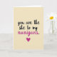 This card features a simple, funny love note on a warm beige background that looks like lightly textured paper. The message is centered in four short lines: “you are the she to my” on top, and “nanigans.” on the last line. The letters look like smooth, flowing handwriting, with most of the text in deep black. The word “nanigans.” stands out in bright magenta, making the joke feel extra sweet and memorable. Just below the words, there’s a small magenta heart that acts like a little finishing touch ❤️. The overall look is minimal, but it still feels personal, like something you’d write to someone you know well. It’s a meaningful card to give when you want to say “we’re a team” with a bit of humor and a lot of affection 🥰, and it’s a friendly way to share Valentine’s Day sentiments.