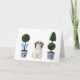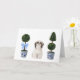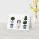 Esta tarjeta de saludo tiene un retrato acuático de un lindo perro shih tzu sentado entre dos topiarios de estilo chinoiserie.