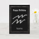 Envíe una tarjeta personalizada de bienvenida Happy Birthday a su Aquarius favorito el Carrier de Agua con este elegante símbolo zodiac de astrología de plata de Aquarius con un marco de doble línea de plata sobre fondo negro. El texto del cartel de Feliz Cumpleaños y Zodiac en la parte delantera de la tarjeta puede ser personalizado si tienes otro saludo en mente. Dentro de la tarjeta se puede añadir el nombre del chica o niño de cumpleaños por encima del texto que dice: Vas a tener un cumpleaños estupendo, está escrito en las estrellas. Una tarjeta personalizada divertida para alguien nacido bajo el signo estrella de Aquarius.