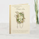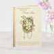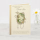 Con una hermosa tarjeta de simpatía funeraria diseñada a medida con una imagen del Santo Rosario y un elegante ramo floral blanco y dorado.