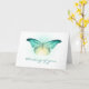 Este diseño presenta una imagen de una mariposa turquesa, verde azulada y amarilla radiante, sobre las palabras "pensando en ti" en escritura a mano verde azulada. En el interior, el texto "con mayor simpatía" aparece en un guión verde azulado coincidente o personalizar con su propio mensaje personalizado.