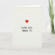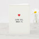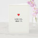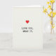 Esta tarjeta del Día de San Valentín presenta un solo corazón rojo intenso flotando cerca de la parte superior, colocado en la porción superior del diseño. El corazón se destaca claramente contra un fondo de color blanco con una textura tenue similar al papel que agrega calidez. Centrado debajo del corazón, el mensaje dice “TE QUIERO, LO DIGO EN SERIO” dividido en dos líneas en letra negra con un aspecto de máquina de escribir. La apariencia ligeramente desigual y estampada da a las palabras un sentimiento sincero y honesto. Sin arte adicional, el enfoque permanece en el corazón y el mensaje. El diseño general se siente tranquilo y directo, lo que hace que esta tarjeta sea una forma significativa de compartir una verdadera afecto con una pareja, amigo o cualquier persona que merezca escucharlo en el Día de San Valentín.