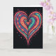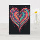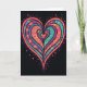 This design shows a large, layered heart centered on a deep black background, making the colors stand out right away. The heart is built from several rings that stack inward, each one filled with repeating patterns like swirls, tiny circles, and small flower shapes. You’ll see hot pink along the outer edge, with sections of electric blue, sunny yellow, and deep purple woven throughout. Little yellow flower bursts sit inside some purple areas, and blue curls wind through other sections like flowing pen lines. Around the heart, small glowing dots in pink and turquoise scatter outward, like sparks drifting into the dark. There’s no text on the front, so the artwork does all the talking and leaves room for your own words inside. It feels meaningful to give because it’s bright, detailed, and says “I’m thinking of you” in a way that works for romance or close friendship 🥰❤️.