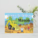 Esta tarjeta de feliz cumpleaños se puede personalizar. Tiene una divertida escena de un sitio de construcción con un camión y trabajadores de la construcción.