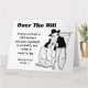 Divertido por la colina, cumpleaños de Old Fart. Una carta grande con letras grandes para un cumpleaños mayor. Un anciano gruñón y torpe, vestido con un gorra, una chaqueta y un bastón, está sentado en una silla de ruedas. Over the Hill está escrito arriba. Luego una pequeña descripción humorística, para el destinatario del cumpleaños acerca de la tarjeta que necesita ser escrita en un texto grande ya que su vista ahora se está desvaneciendo a esta edad, entre otras cosas. Adentro y en la espalda continúa con más bromas envejecidas, Feliz Cumpleaños Viejo Fart.