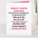 Diseño original de la tarjeta de sobrevivientes de cáncer de mama de Nisha Prabhu. ¡Celebra la fuerza y la resiliencia con nuestra tarjeta de sobrevivientes de cáncer de mama! Esta tarjeta de bonito diseño es la manera perfecta de honrar el increíble viaje de una sobreviviente. Con colores que te subirán y mensajes inspiradores, es ideal para transmitir tu amor y apoyo. Ya sea como un regalo sincero o como una nota reflexiva, esta carta encarna el coraje, la esperanza y el triunfo de superar los desafíos de la vida. Únete a nosotros para difundir conciencia y empoderamiento -¡porque cada sobreviviente merece ser celebrado! Perfecto para cualquier ocasión, haga hoy una declaración significativa con esta tarjeta especial!