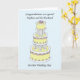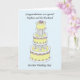 Un pastel de bodas con gradas multi contra un fondo azul en colores pastel. La imagen es acompañada por las palabras "a un sobrino especial y a su marido en su día de boda".