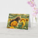 Una tarjeta del solsticio de verano con un gato naranja a rayas de tigre lindo mirando una mariposa en un campo de girasoles de verano.