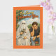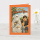 This charmingly awkward greeting card features a classic female sheet-ghost offering a bouquet of flowers to a visibly upset male seated beside her on a park bench. With retro-inspired illustration, warm nostalgic tones, and bold lettering that reads “I’m Sorry I Ghosted You,” this design humorously captures the all-too-relatable dating phenomenon of disappearing without explanation.