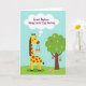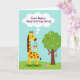 This design shows a tall, long‑necked animal with a bright yellow coat and warm brown spots, standing on fresh green ground under a pale blue sky. Its rounded eyes and soft pink cheeks give it a tender, friendly look, as if it’s sharing a quiet moment with someone just off to the side 🐰. The animal holds a small patterned basket in its mouth, and inside sit two decorated eggs—one pink and one green—nestled close together like a little shared treasure. To the right, a stylized tree with an emerald‑green canopy spreads wide, and its branches feel welcoming, like they’re inviting you to join the search 🌷. Dozens of pastel eggs hang among the leaves with stripes and dots in lavender, coral, and light blue, and a few small open baskets dangle from sturdy limbs, each filled with more eggs. Near the top, a cloud‑shaped thought bubble contains the message “Great Nephew Happy Easter Egg Hunting” in dark lettering, placed above the animal’s head for easy reading. The tree’s rounded canopy is dotted with eggs in mixed patterns, and several tiny baskets hang at different heights from the branches.