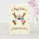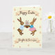 This card shows two light-brown bunny characters facing each other in a gentle, friendly pose 🐰. One wears a light blue-and-white striped shirt, while the other has a blue polka-dot top with a pink-and-white plaid skirt, giving them a sweet, coordinated look. Their paws meet around a small woven basket, as if they’re sharing a gift together, and their soft expressions suggest quiet affection. The basket is filled with pink and purple flowers and a few slender budding branches, adding a fresh spring touch 🌷. Behind them, a creamy yellow background is decorated with faint egg-shaped motifs scattered evenly across the page. A banner near the top holds a short seasonal greeting in dark lettering, and a second banner below includes a brief dedication in the same color. The lighting looks softly diffused, keeping the pastel tones gentle and the textures smooth. The lower banner curves under their feet, framed by the pale yellow field and the subtle egg pattern.