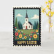 This greeting card shows a spring countryside scene framed like an old postage stamp with tiny edge notches and a lightly worn texture. In the center sits a small white chapel with a dark steeple topped by a cross, and a red front door that feels like an open invitation for friends to step inside together. Deep green evergreen trees cluster around it, set against a calm blue sky with rounded, soft clouds. The foreground is a rolling meadow packed with big golden-yellow blooms, coral-red flowers, and small white star-shaped blossoms, with extra pink and orange touches scattered between 🌷. The colors are bright but gently muted, giving the scene a cozy, affectionate look, as if the landscape is leaning in to welcome you 🐇. Near the bottom, the words “HAPPY EASTER” sit centered in large golden letters with a slightly grainy texture. The chapel’s red door stands out beneath the steeple, framed by flowers that crowd the lower edge like a natural border.