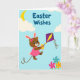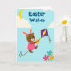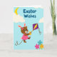 This design shows a spring scene with a cheerful brown-furred bunny character 🐰, shown mid-step as if heading toward a friend with an eager, gentle energy. The bunny has tall ears with pink inner details and a matching bow, and it wears a bright pink dress with a small fluffy white tail peeking out. One paw lifts a purple-and-yellow kite with geometric shapes, while the other holds a striped egg in soft yellow and pink perched on a thin stick, like a little treat meant to be shared. The background is a calm sky-blue field that keeps the focus on the character and its sweet, inviting pose. Near the top, the words “Easter Wishes” sit in rounded deep teal lettering, centered and easy to read. In the upper left, cream-colored clouds float below a slim golden crescent, adding a quiet, dreamy touch 🐇. At the lower right, three pinwheel-like flowers in fuchsia, teal, and orange cluster together as bright accents against the blue.