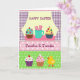 Designed with three horizontal panels, this spring-themed illustration uses soft pastel colors and cozy patterns to set a friendly, affectionate mood 🌷. The top panel has a gentle yellow background with purple-and-white checkered drapes along the sides, like curtains framing a kitchen scene. On a pink surface sit two frosted desserts with sprinkles and red fruit accents, placed on either side of a teal mug that holds two small patterned flags, arranged like a pair leaning toward each other. A holiday greeting appears above in thick, dark lettering, centered near the top of the yellow area. The middle band is rose pink with small white polka dots, and a short dedication sits across it in flowing cursive-style lettering in a darker shade for contrast. The bottom panel shifts to fresh green with white polka dots, showing two more decorated treats beside a small golden-yellow chick with orange beak and feet, adding a sweet companionable touch 🐰. Rounded scalloped edges border the whole piece, and the chick stands near the right side of the green panel next to the desserts.