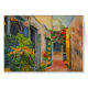 Esta colorida tarjeta de notas muestra la adaptación de un bonito cuadro de arte de una pequeña calle de Santa Cruz, Islas Vírgenes, por la artista estadounidense Anna Unterman. La escena luminosa y soleada es un revuelo de colores. Sobre el arco hay una vid de buganvillas de color rojo, rosa y magenta, así como viñas de llama naranja y otros arbustos y hojas verdes. Los edificios de colores son amarillos, dorados, azules y verdes. Reproducida con permiso de la finca de Anna Unterman. Todos Los Derechos Reservados.