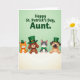 This greeting card features a soft light-sage gradient background with dark green text across the top that reads, “Happy St. Patrick’s Day, Aunt,” centered and easy to spot. Below the message, four cartoon-style animals—two cats and two dogs—peek over a cream-colored horizontal panel as if they’ve gathered close to greet her together. Their wide eyes and small smiles feel like a friendly, affectionate exchange, like they’re sharing a sweet inside joke 💚. Three of them wear tiny green top hats with little golden buckle details, tying the group neatly into the St. Patrick’s Day theme ☘️. The fourth is a gray cat wearing a green bow tie, adding a slightly dressy touch beside the others. The characters are drawn with smooth shading and simple lines, keeping the scene calm and cozy. The cream panel spans the lower part of the design, with the four faces and hats lined up above it in a neat row.
