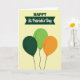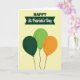 On the front of the card a creamy yellow background sets a calm stage for St. Patrick’s Day, with a deep emerald banner stretching across the top. Centered on that banner, “HAPPY St. Patrick’s Day” appears in dark green, with “HAPPY” in thick, straightforward letters and the rest in a flowing style that feels like a gentle flourish. Below, three balloons drift upward on a diagonal, as if they’re leaning toward each other like close friends sharing a private laugh 💚. A rich dark green balloon sits to the left, a lighter lime-green balloon floats slightly higher near the middle, and an orange balloon rises to the right, adding a warm contrast ☘️. Soft shading gives each balloon a rounded, airy look, like you could almost press a fingertip into the surface. Thin black strings hang down in loose curves, crossing lightly as they trail toward the bottom. The orange balloon is positioned highest, with its string arcing downward against the pale background.