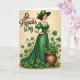 On the front of the card an elegant woman stands in a sweeping emerald gown that pools at the floor, the fabric catching light like satin and drawing your eye to her poised stance 💚. Her dress has puffed sleeves with creamy cuffs and a softly ruffled neckline, and a wide-brimmed green hat sits above reddish-brown hair, tied with a neat bow. Her rosy cheeks and deep red lips pair with sparkling earrings and a green gemstone pendant, giving her a gently flirtatious, “come closer” look. In the upper left, the words “St. Patrick’s Day” appear in decorative lettering, colored in warm browns and greens against a pale background. Around her, shamrocks rise from the ground and spill outward, as if they’re surrounding her like a friendly crowd ☘️. At her feet, a bronze-gold pot tips slightly, overflowing with clover that spreads into a lush patch of green. Soft lighting adds a golden tint to the scene, and the shamrocks cluster thickest near the pot with scattered leaves reaching toward her hemline.