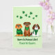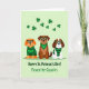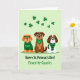 This card shows three dressed-up, humanlike dogs posed in a neat row against a soft green background, their serious faces made sweeter by matching dark-rimmed glasses. A russet spaniel-type stands on the left, a solid brown pup is in the middle, and a white-and-brown beagle-type is on the right, all close enough that their shoulders nearly touch like good friends leaning in for a photo. The center dog wears a green bandana with a shamrock, while the left dog has a green sweater dotted with clovers and the right dog wears a green-and-white striped shirt, tying them together in a cozy St. Patrick’s Day look 💚. Above their heads, small shamrocks float like confetti, adding motion to the calm, balanced layout ☘️. The greeting text sits below the trio, with “Happy St. Patrick’s Day!” placed first and “Favorite Cousin” following beneath it in a matching green tone that stands out gently from the background. The dogs’ steady gazes and slightly raised chins suggest a quiet, affectionate pride, as if they dressed up just to impress someone they care about. The scene is finished with scattered emerald clovers overhead and layered shades of green filling the backdrop.