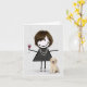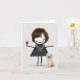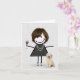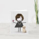 Cute stick figure girl in sneakers, polka dot dress, pearl necklace with a glass of red wine and golden retriever dog on a soft gray terrazzo background
