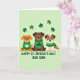 This greeting card shows three cartoon dogs standing close together on a pale green background, their friendly faces turned toward you as if posing for a group photo 💚. The orange-furred dog on the left wears a green sweater with a white shamrock on the chest, leaning in with an easy, buddy-like closeness. In the middle, a brown dog sports a dark green bandana with a shamrock emblem, giving the others a steady, affectionate look that feels like family. On the right, a white-and-light-brown dog wears a green striped sweater, angled slightly toward the center as if sharing the moment with the pair. All three wear oversized green-rimmed rectangular glasses, adding a cute, slightly studious touch that makes them look like best friends ready for a fun day ☘️. Along the bottom edge, the message “HAPPY ST. PATRICK’S DAY! OUR SON” appears in bold sans-serif lettering in dark green, centered and easy to spot. Small shamrocks float above their heads, scattered across the upper area of the soft green backdrop.