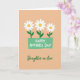 This card shows three matching, stylized flowers with bright white petals and golden-yellow centers, standing close together like friends sharing a quiet moment ❤️. Each bloom sits on a slim green stem that rises from a mint-green rectangular planter in the middle of the design. Across the front of that planter, a short celebratory message is placed in simple sans-serif lettering, set in a darker green so it reads clearly. Under the main illustration, a second line of text appears in a flowing calligraphic style, also in deep green, like a soft note tucked beneath the flowers. The background is a muted peach tone with a faint, grainy texture that adds warmth without stealing attention. Gentle greens and sunny yellow accents bring a light, affectionate mood, like a small bouquet offered with an easy smile 🌼. The mint-green planter sits centered on the page, with the two lines of green text stacked neatly beneath the trio of blossoms.